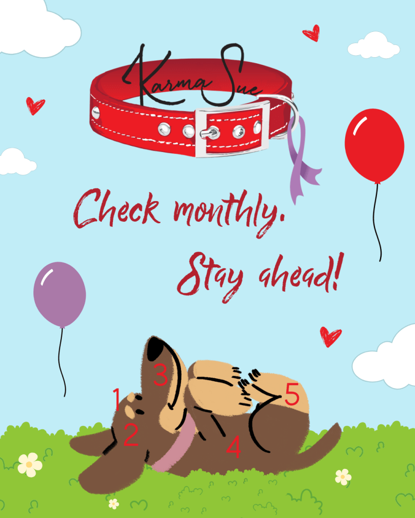 Designate one day each month to check your companion animal for any new or unusual things. Utilize the body maps below to identify and track any changes you see regarding your companion animal and share them with your veterinary professionals during scheduled appointments. When doing monthly checks, focus on these five areas: